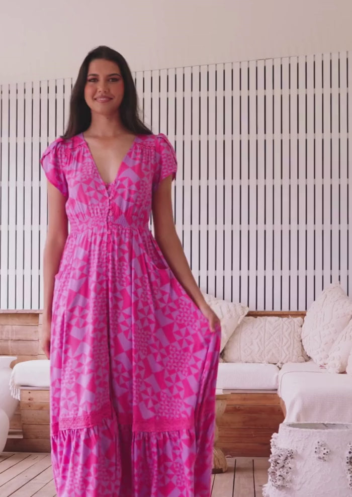 Jaase dress, Azalia model, geometric print in fuchsia tones