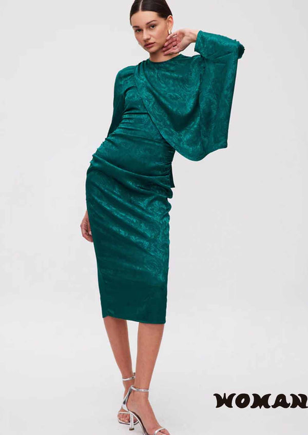 Club Green (MIOH) est bien plus qu'une simple robe midi asymétrique à manches longues. Ce qui rend ce modèle si unique, ce sont ses manches cape amovibles : grâce à elles, vous aurez l'impression d'avoir deux robes de soirée en une . Que vous la portiez pour un mariage, en journée ou en soirée, vous ferez sensation.
