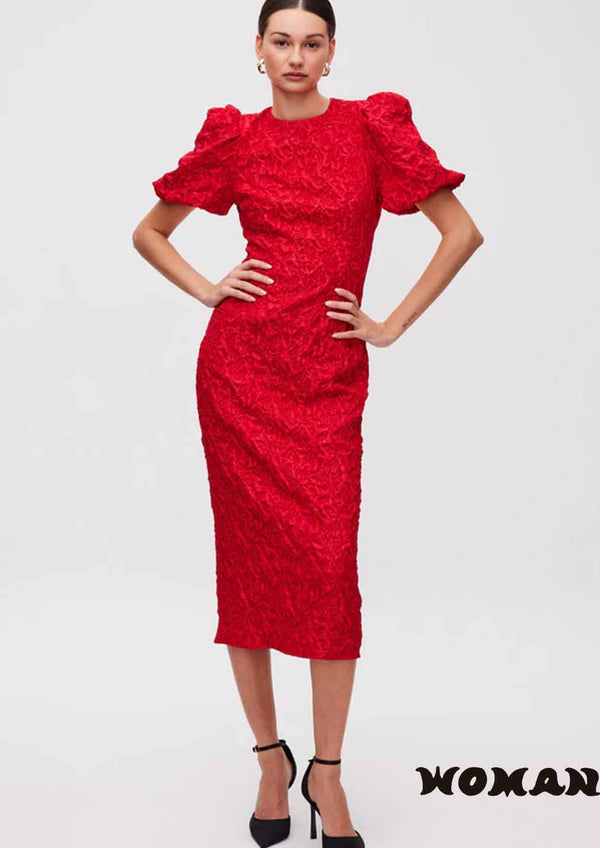 Éblouissante et captivante, la robe Concert Red (MIOH) est faite pour éblouir . Son décolleté trapèze au dos apporte une touche sensuelle, et ses manches bouffantes subliment parfaitement la silhouette. Confectionnée dans un somptueux damassé rouge, elle est parfaitement adaptée.