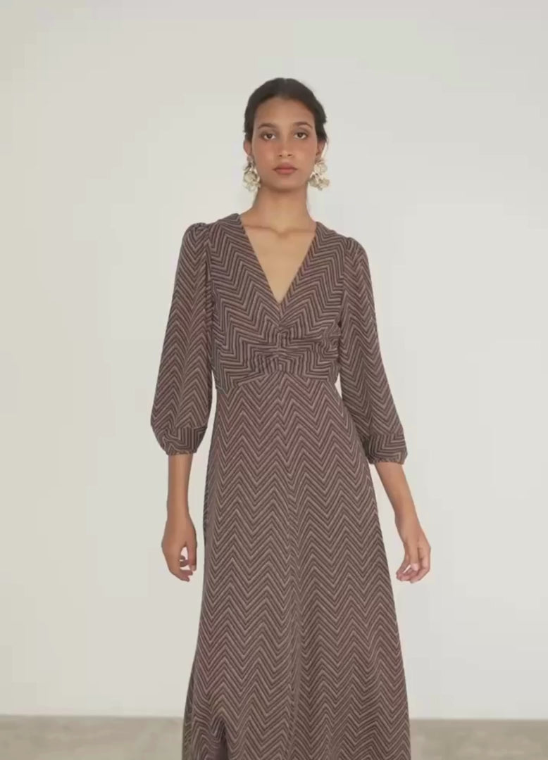 - Vestido midi con escote en pico.