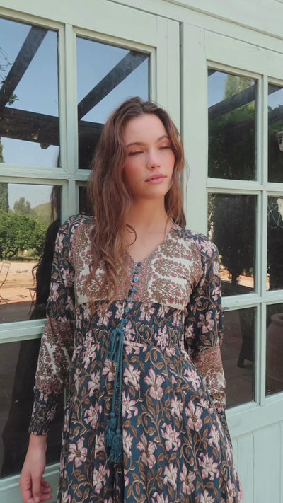 El vestido maxi boho Jaase Sabrina lo tiene todo: elegantes mangas largas con puño nido de abeja, cuerpo entallado y cintura fruncida que define la silueta. Su diseño abotonado permite llevarlo como un vestido fluido o como kimono-duster, adaptándose a tu estilo con versatilidad.