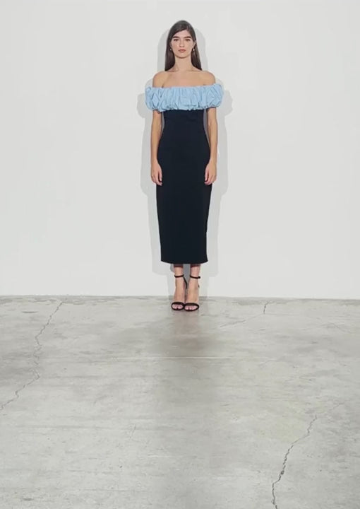 El vestido Mioh Julieta Black es damasco bardot volante estructurado con diseño sofisticado y perfecto para bodas, fiestas y celebraciones especiales. Confeccionado en tejido fluido de alta calidad.