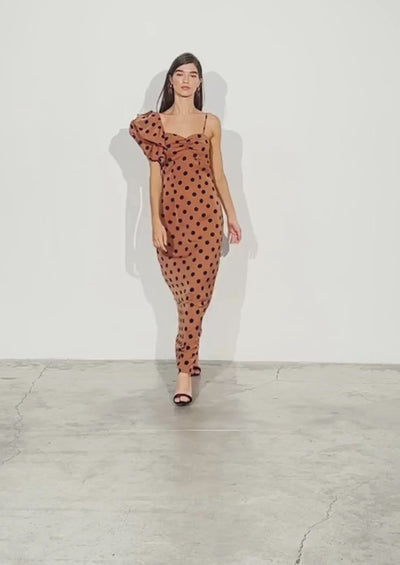 - Vestido largo confeccionado en tejido satinado con estampado de lunares en contraste.